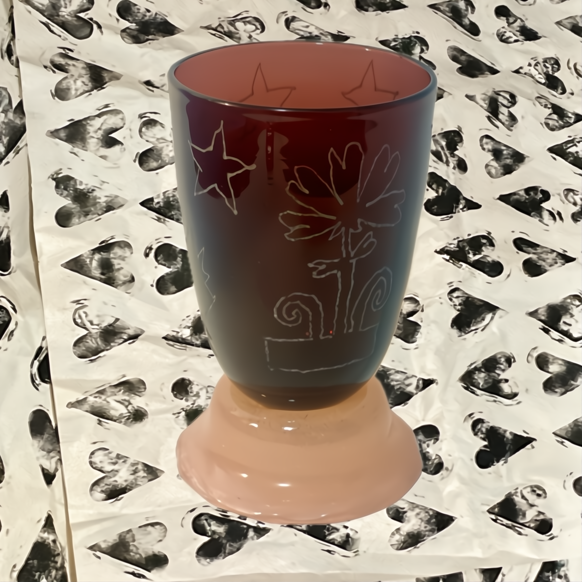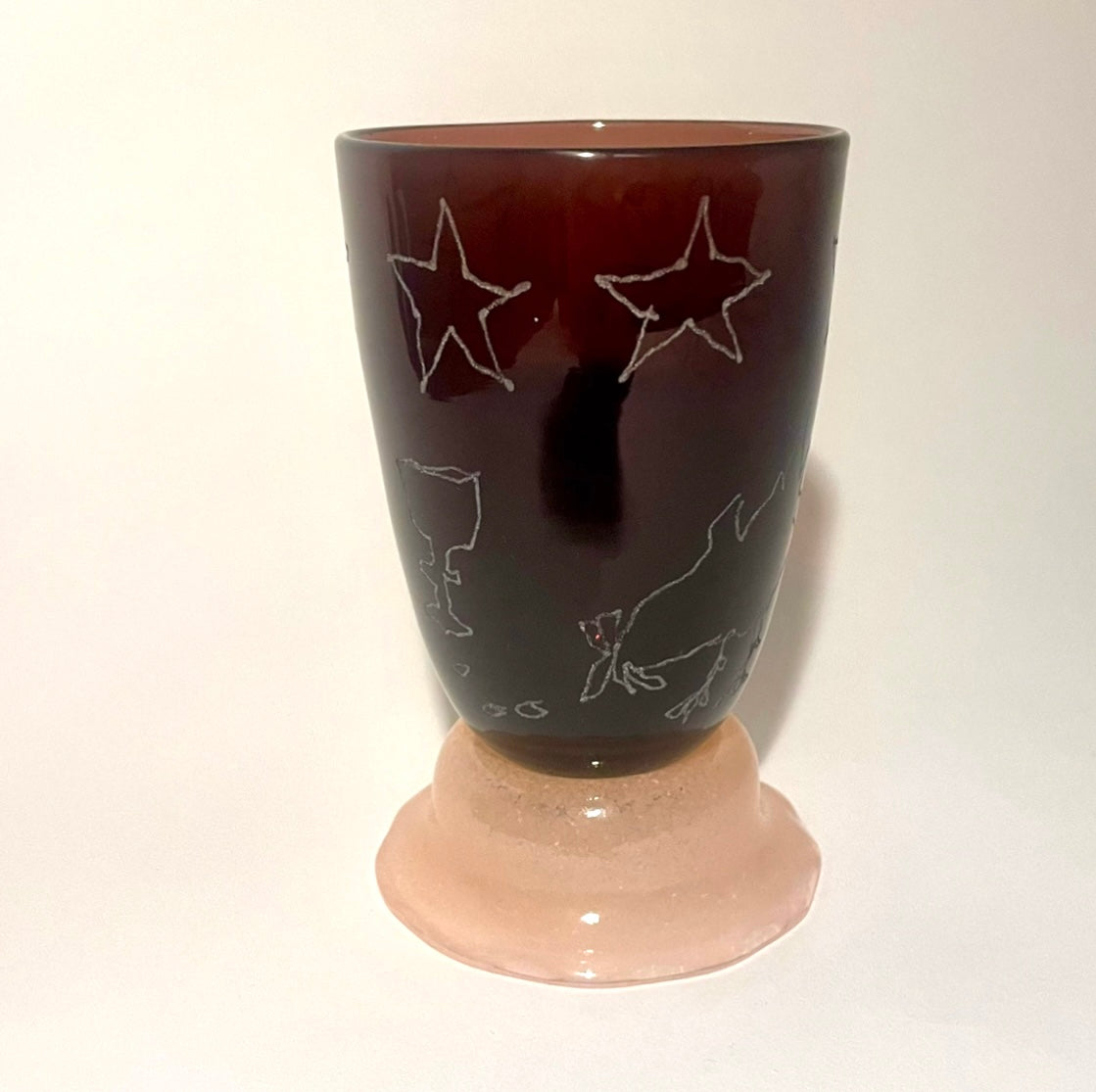 Handmade glass tumbler, aubergine cup with a pink foot, 8 oz.